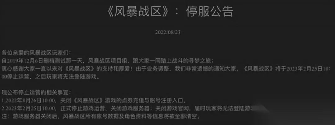 勉强坚持了四年,到2023年2月份,创天互娱宣布《风暴战区》停服。至此游戏的国服之旅应该说是彻底结束了。