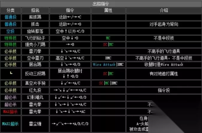 超必杀技 雷光拳 ↓↘→x2+A/C 超必杀技 幻影飓风 ↓↙←x2+B/D MAX超必杀技 雷光拳 ↓↘→x2+AC MAX2超必杀技 雷尘缠 →↙↘←→+A/B/C/D