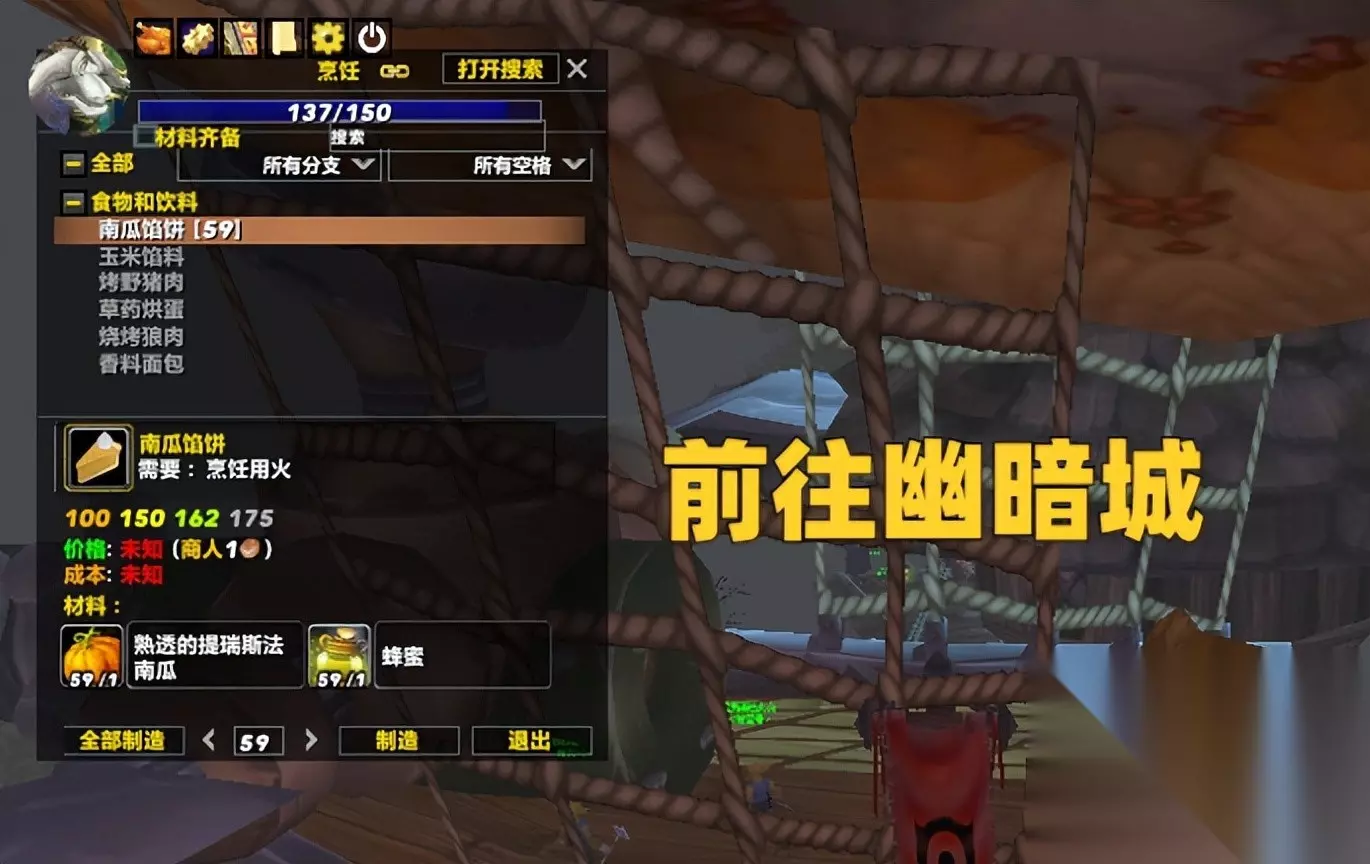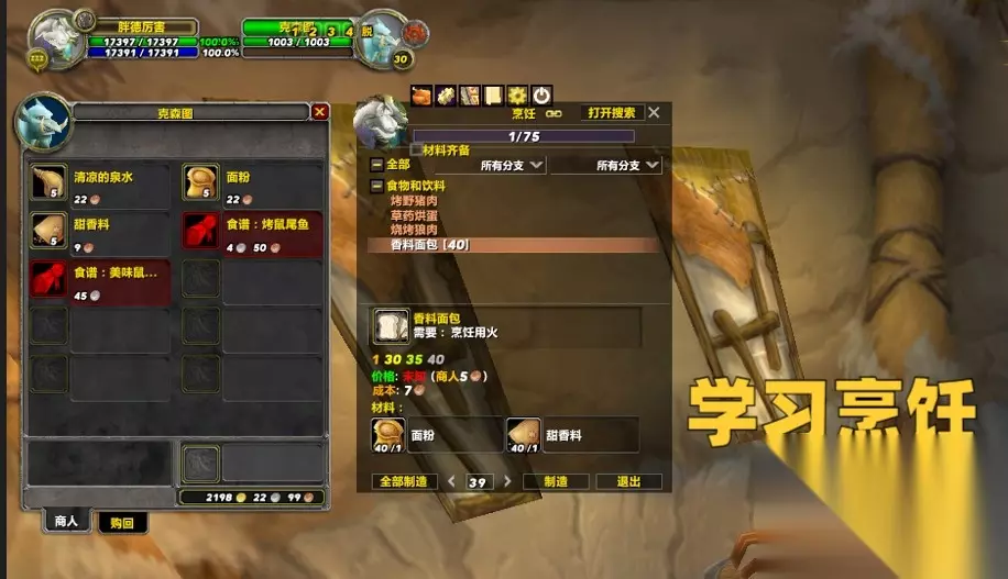第一步先去主城学习烹饪专业,然后在专业训练师那里直接购买面粉和甜香料,制作香料面包把烹饪冲到40左右。
