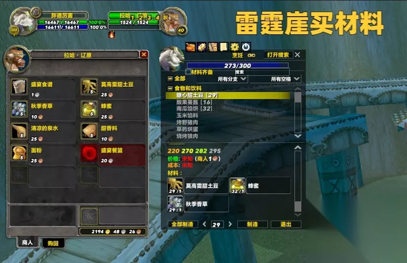 第六步是学习盛宴食谱中的糖心甜土豆,联盟方的要去达纳苏斯购买材料,部落方需要去雷霆崖下面购买材料。糖心甜土豆可以让玩家把烹饪冲到280级,不过胖哥建议大家直接做到灰色,目的是节省下一步所需的材料。 第七步是学习盛宴食谱中的慢烤火鸡,这个配方需要用到火鸡肉,而NPC那里是不出售的,只能由玩家自己去打,联盟方可以去暴风城外面的艾尔文森林打材料,部落方可以去幽暗城外面的提瑞斯法林地打材料。