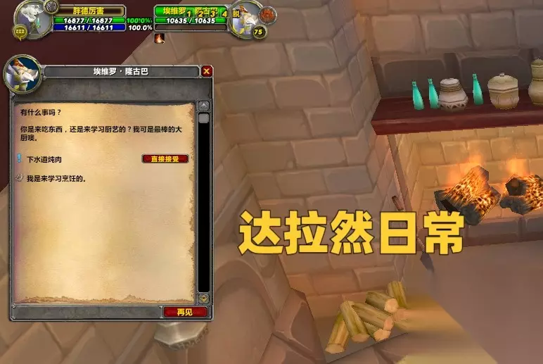 冲到350之后直接回达拉然旅馆,然后就可以把烹饪上限提升到450了。同时也开启了达拉然烹饪日常,至于之后的等级,就没有比较纠结了,慢慢做日常就可以做上去了。如果着急的话,也没关系,目前WLK版本的烹饪材料价格相对较低,随便冲一冲也就上去了。
