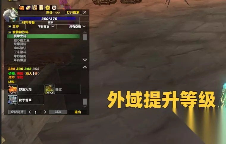 打完材料之后,直接前往地狱火半岛,联盟去荣耀堡,部落去萨尔玛提升烹饪上限,然后使用慢烤火鸡配方直接冲到350就可以了。