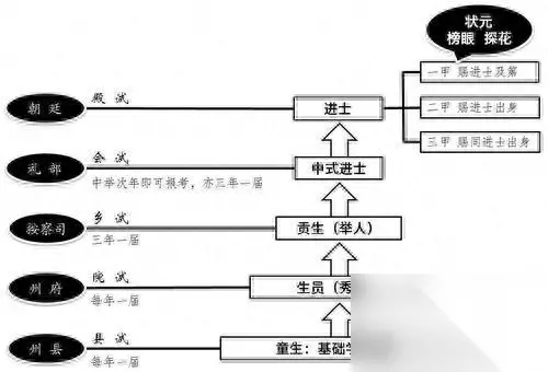 首先要在还是学徒期的童生时期就要展露头角,在县试中通过知县的考验,之后才能去参加省级考试"院试",得到各省的提学道的认可后,才能成为一名秀才,才真正意义上获得了参加科举的资格。成为秀才的第一关就是每三年举办一次的乡试,乡试的主考官不再是地方长官,而是由皇帝派出信任而又有学识的人担任主考官。通过乡试的考生成为了举人,没错就是"范进中举"的那个举人。成为举人后就相当于成为了国家干部的预备人员,在乡试的第二年,举人们可以进京赶考参加会试。