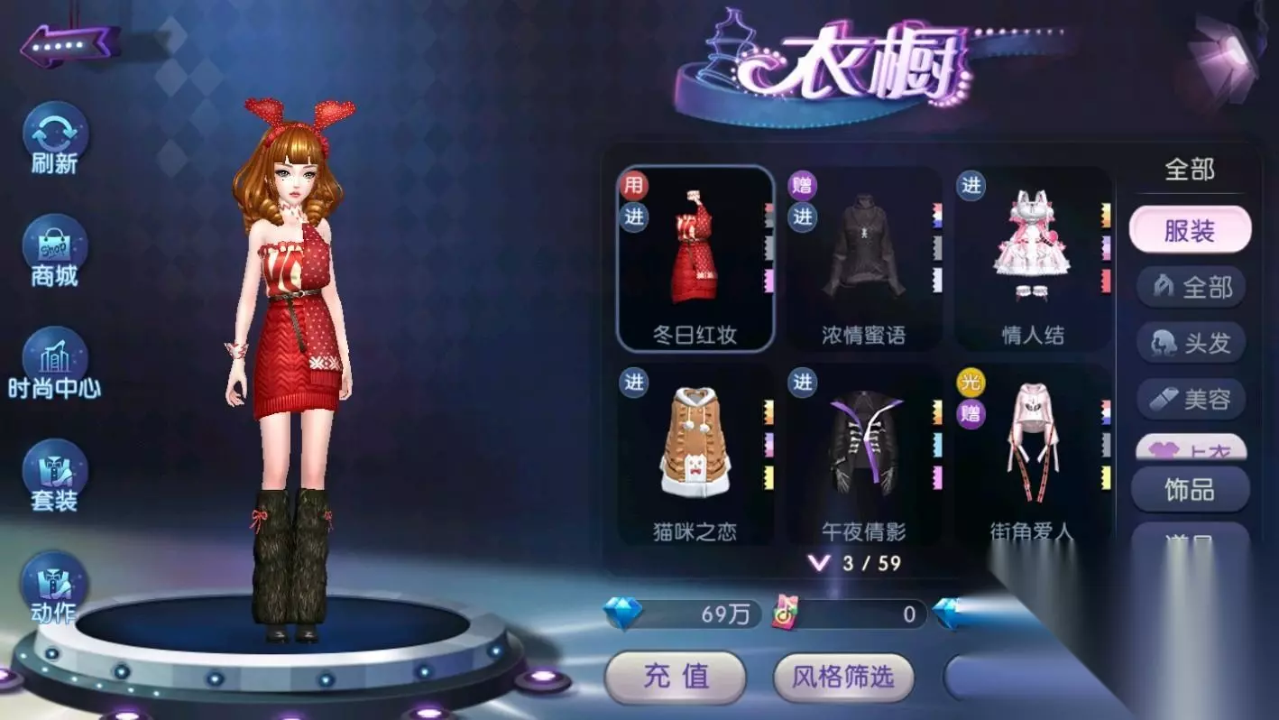 冬日红妆以酒红色为主,浪漫又华丽。男士时尚是西装搭配格子衬衫,红色围巾末端用黑色装饰,更显优雅。时尚女装的针织毛衣连衣裙,用波点、条纹、雪花装饰,再加上可爱的头饰,甜美又浪漫。冬日红妆也有新表情。为了配合以酒红色为主色调的服装,男女的瞳孔都是深绿色的。男性的眼影和女性的痣进一步提升了人物的魅力。