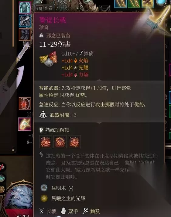 《警觉长戟》面板很好的同时附带1d4力场伤害(光耀和火焰是我的装备和buff上的)还有+1先攻与察觉鉴定优势判定(双骰子判定基本不会被骗)反应攻击优势使借机攻击基本不会空,武器附魔+1极大提高dps,于月出之塔熊地精商人高价购买,可以通过战士对话说服拉满好感度降价购买。