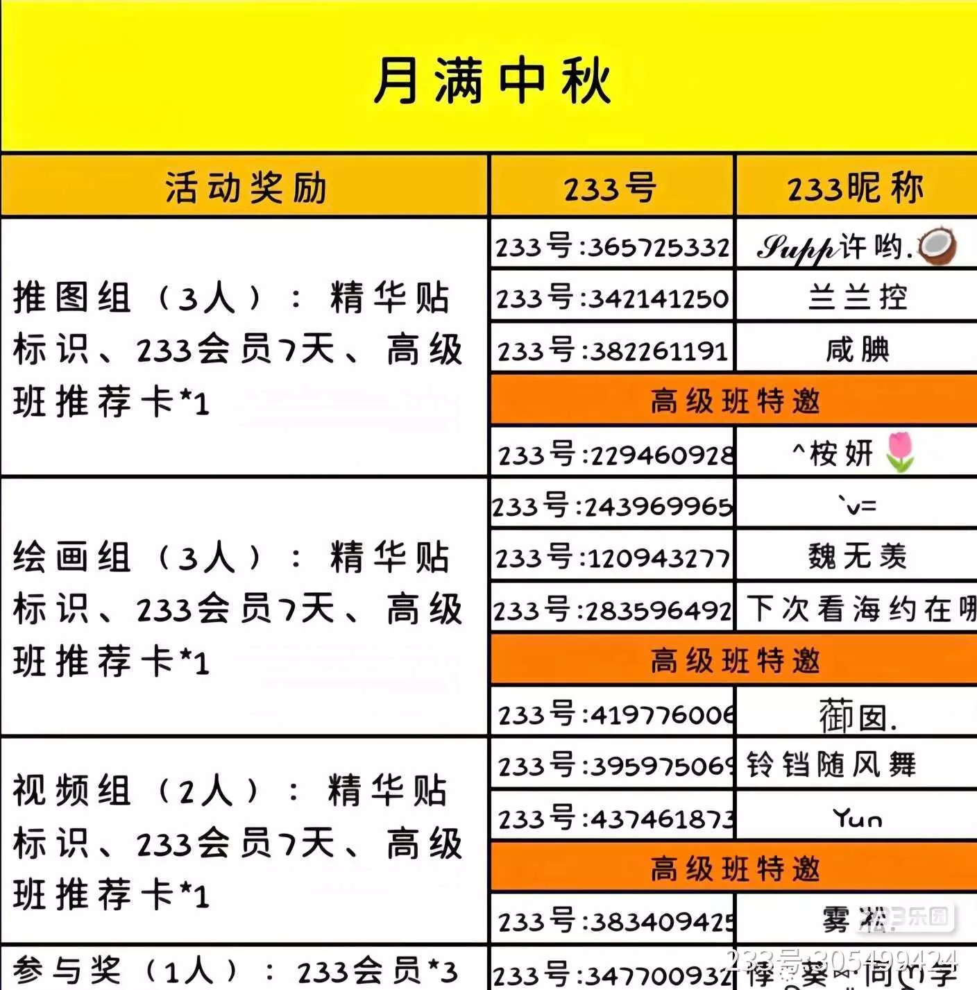 ✨视频组(5人):精华贴标识、233会员7天、高级班推荐卡*1
