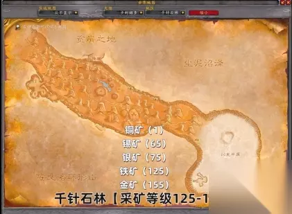 125-175级 千针石林,125级开始挖铁矿,155级开始可以挖金矿。