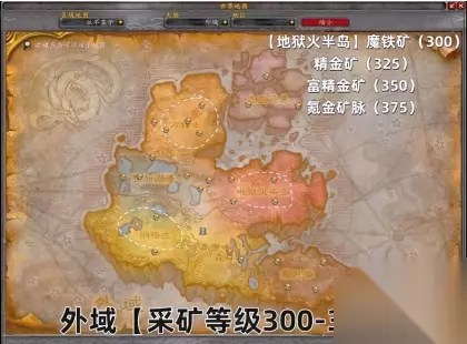 300-375级 外域,300级开始挖魔铁矿,250级开始挖精金矿。