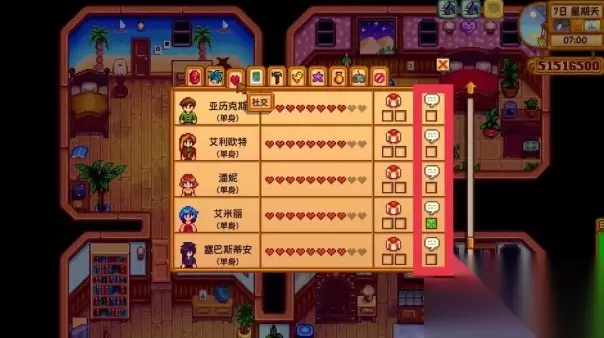 每个村民的基础好感为十颗心,而每颗心则拥有二百五十点的好感度。如果是单身状态的村民则只有八颗心,需要不断赠送花束来达到十颗心的上限值,如果结婚之后好感度可以上升到十四颗心。当与村民进行交谈时对话框的右边就会出现一个圆圈代表的就是好感度,如果村民在特殊的剧情动画中则可以额外提升十点好感度,单个村民一天只能提升一次。玩家可以在社交界面查看具体的村民聊天选框,要是显示打叉的话就说明今天已经与该村民交谈过了。