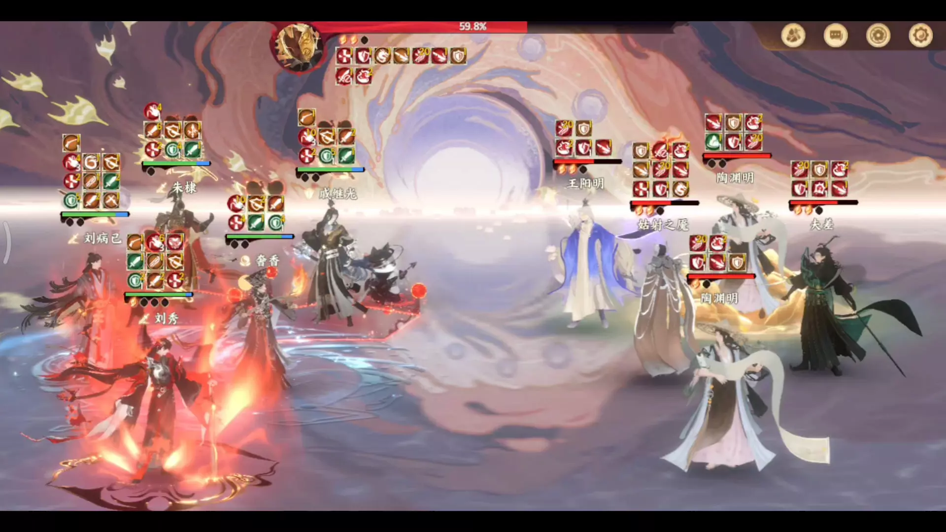 这是手游《忘川风华录》的对战情报,展示了以赵匡胤、辛弃疾等名士组成的阵容对战的画面,击败蝴蝶君是玩家的目标,他是川阵营的标志性存在。