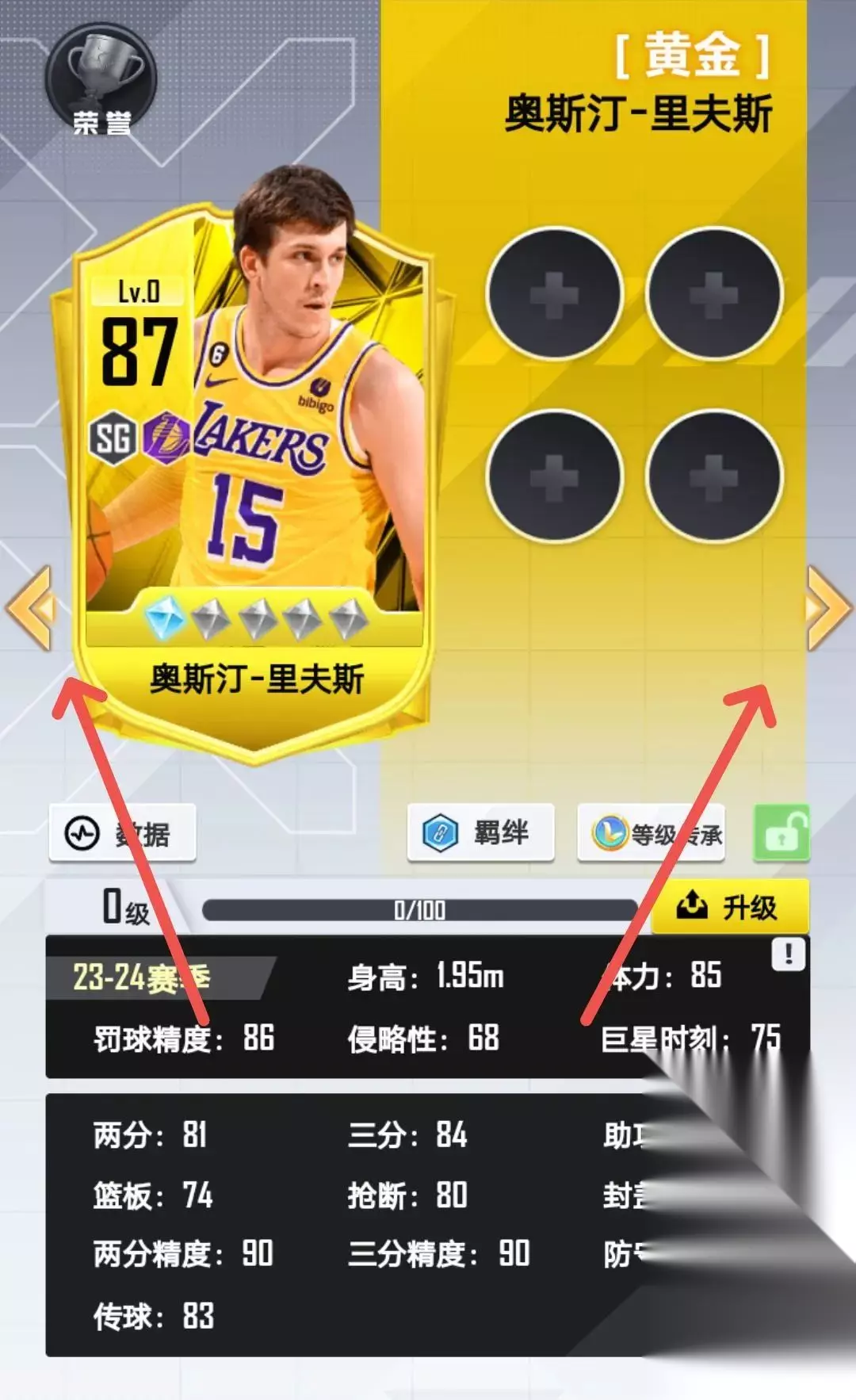 (最终效果以更新后实际效果为准) 新增羁绊图鉴,各位玩家可通过图鉴查看每一组羁绊详情,到底哪些球员组合能产生最强的化学反应,一切都看你的排兵布阵啦! 卡牌详情页可切换球员 此次更新完成后,各位玩家在卡牌详情页即可进行球员切换操作