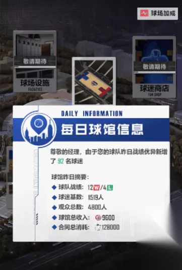 (最终效果以更新后实际效果为准) 只需点击卡牌左右两边的箭头按钮即可根据卡牌顺序随意切换卡牌,这样再也不用担心找不到想要找的卡牌啦! 球馆模式显示优化 本次更新我们也将对球馆模式进行显示优化,更新前各位经理人需在球馆经营切页中点击明细才能查看昨日经营详情。 更新后,每日首次进入球馆即有球妹一手送上昨日战绩汇总哟~