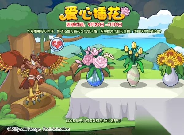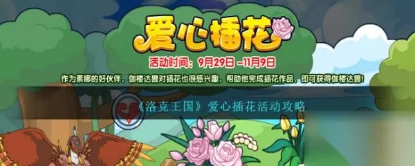 《洛克王国》爱心插花活动攻略 爱心插花 作为素娜的好伙伴,伽楼达兽对插花也很感兴趣,帮助他完成插花作品,即可获得伽楼达兽!(玩家每拥有1个“数码核心”可每天额外获得1次帮助机会。) 活动时间:9月29日-11月9日 活动地图:宠物园 活动获得:伽楼达兽,爱心徽章,礼遇契约