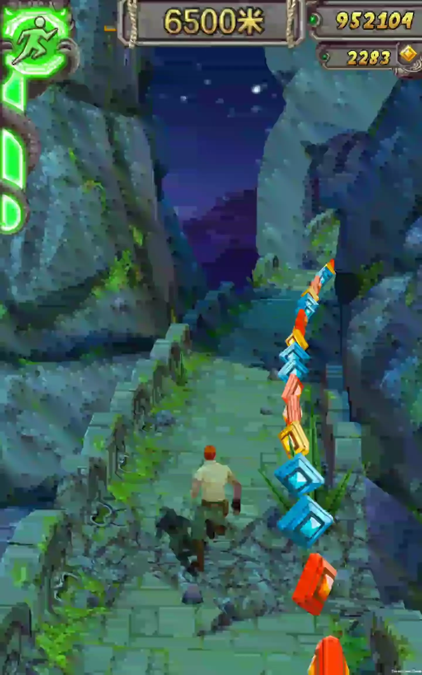 这是跑酷游戏神庙逃亡的天空穹顶地图挑战展示,该地图挑战分不同难度,对应不同距离与积分奖励,本次为简单难度3000米的跑酷挑战,展示了神庙逃亡天空穹顶的跑酷流程与场景。