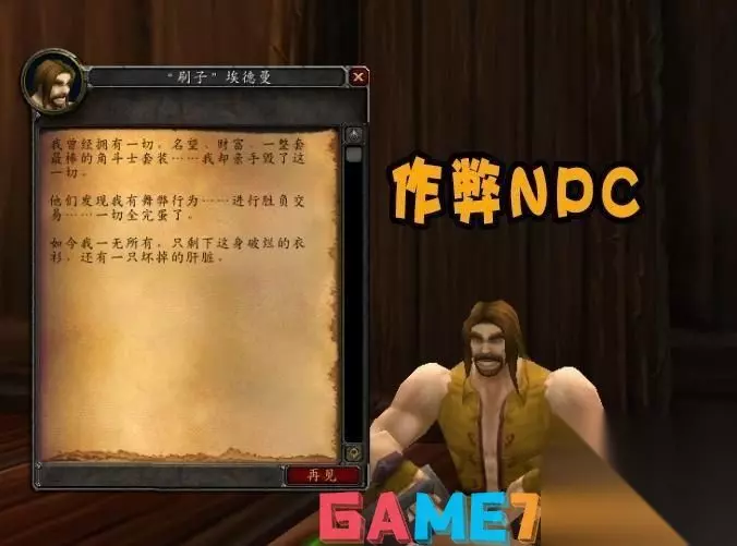 2,被惩罚的玩家。同样是达拉然下水道,坐标(41,34)的位置,可以看到一个名为“刷子”埃德曼的人类NPC,他在一旁坐着喝闷酒,与其对话可以得知,该NPC曾是一个拥有顶级PVP装备的角斗士,只可惜后来因为“舞弊”问题被惩罚,最后装备也被没收了,变得一无所。