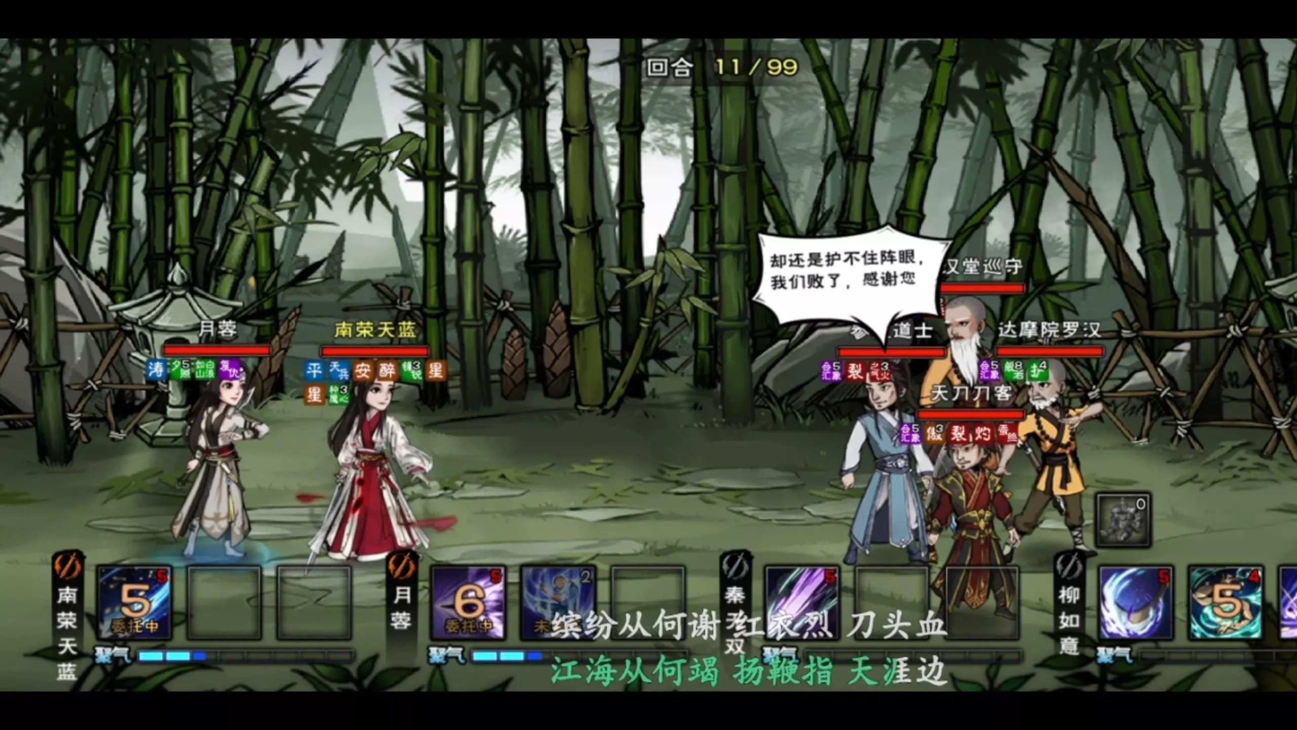 这是《烟雨江湖》的战斗攻略帖,展示了用吴萧柳、陶渊溢等四名棍系角色,对战别院的田萧柳如意、尹茂、顾离等敌人的战斗过程,呈现了多回合战斗里的攻击、治疗等战斗表现,实现四棍大败别院敌人。
