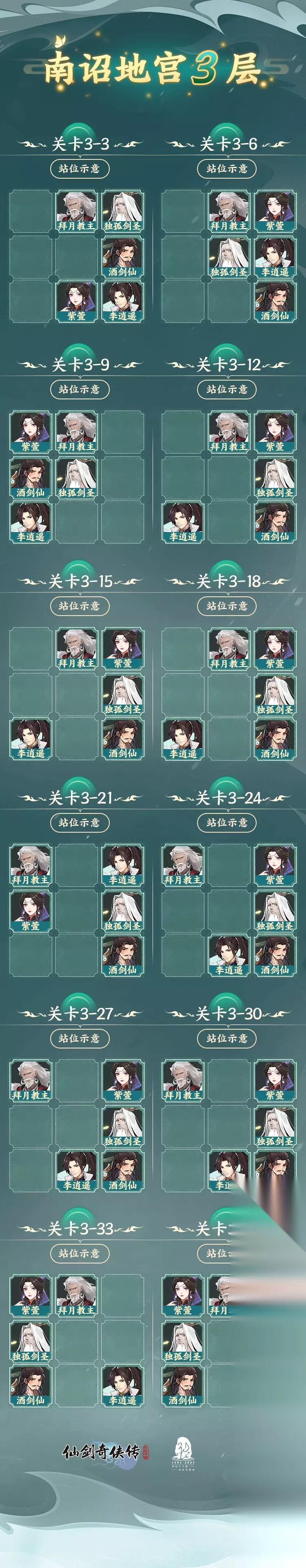 本攻略由 明星攻略官:jm创作 *不代表官方观点 主线战斗阵容持续分享。今天给大家带来南诏地宫第三层的通关攻略。我们将重点分析jm大神的推荐阵容和站位技巧,同时针对难点敌人给出应对方案。欢迎各位籼米继续关注,让我们一同开启新的挑战吧!攻略马上开始! 南诏地宫三层 伙伴配置 1、独孤剑圣(117级):白3圆满(上阵天地灵脉),五气朝元第2层(肺2)。 天赋14,修炼13(并升满)。 装备:橙9星套(九曜),装备强化连锁140。 镶嵌:仙•鳐仙(4级),其它真•石头(梦貘10、赤炎10、九尾8、人蛇7、蝎魃6)。 神兵:5星墨梅。 灵蛊:3星傀儡、3星水神、2星天命、3星冰蚕、2星幽灵、2星火神。 御魂:战意勃发(神铸套,铭刻1号,2号攻击满)。 2、拜月教主(117级):白3圆满(上阵天地灵脉),五气朝元第3层(脾8)。 天赋13,修炼14(并升满)。 装备:橙9星套(九曜),装备强化连锁60。 镶嵌:仙•鳐仙(8级),真•石头差1个九尾(人蛇9、蝎魃7级、赤炎4、梦貘4)。 神兵:3星离魂。 灵蛊:3星傀儡、1星金蚕,4紫(火灵、飞蝇、希望、相思)。 御魂:同仇敌忾套(神铸套)。 3、酒剑仙(117级):白3圆满(上阵天地灵脉),五气朝元第1层(脾2)。 天赋12,修炼13(并升满)。 装备:橙7星套(罗睺),装备强化连锁40。 镶嵌:2真3橙1紫(赤炎7、蝎魃4)。 神兵:5星一去不返。 灵蛊:3星飞鱼,3星水神、3紫1蓝(毒蛛、暴烈、飞蝇、神游)。御魂:战意勃发套(神铸套,铭刻1号、2号攻击满)。 4、紫萱(117级):白3圆满(上阵天地灵脉),五气朝元第3层(心8)。 天赋12,修炼13(并升满)。 装备:橙7星套(罗睺),装备强化连:100。 镶嵌:3真3橙(赤炎9、人蛇4、蝎魃4)。 神兵:4星洛神。 灵蛊:3星飞鱼,3星冰蚕,4紫(毒蛛、希望、水灵、贪吃)。 御魂:战意勃发套(18级,铭刻1号、2号攻击满)。 5、李逍遥(116级):9星。 天赋9,修炼7(并升满)。 装备:橙7星套(罗睺),装备强化30。 镶嵌:3橙3紫。 灵蛊:5紫1蓝(火灵、贪吃、水灵、相思、暴烈、瞪孕)。 御魂:同仇敌忾套(18级)。 云篆:2套6级,2套5级。 注:主力英雄所有的御魂都至少铭刻了1次(加多少属性看脸)。 伙伴站位