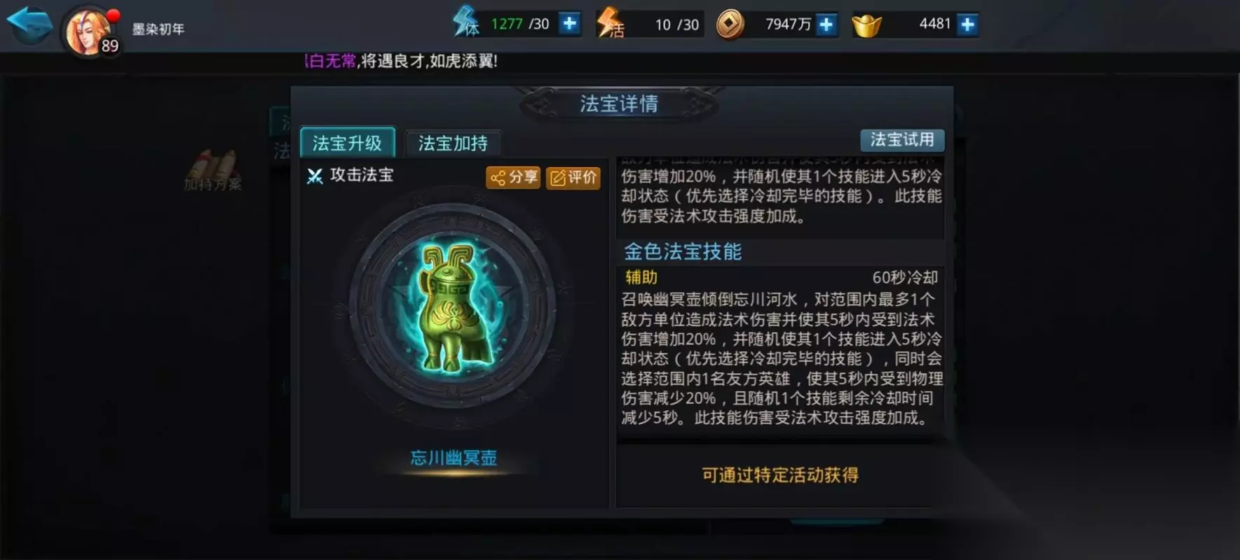 除了被动加成,法宝在的主动技能也很关键。战斗时,屏幕下方会显示已装备法宝的主动技能图标,点击即可释放。主动技能有5-30秒不等的冷却时间,不同法宝效果差异极大。有的是范围伤害附带减速的紫金葫芦,有的是能生成护盾并反弹伤害混铁棍。实战中需根据战局灵活使用,例如敌方英雄聚集时释放范围伤害法宝,友方残血时及时启动治疗技能,才能最大化主动技能的价值。想要让法宝持续变强,可从升级、升星与洗练三个方向下手。需消耗法宝经验丹、碎片和元宝。提升法宝等级后可解锁更高属性上限,等级限制会随品质递增。