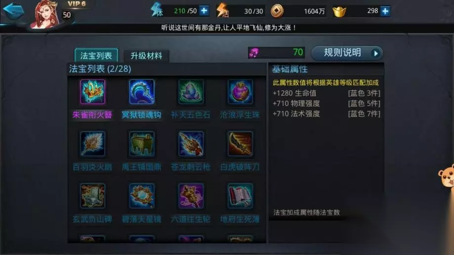 每个英雄通常可装备2个法宝,从背包中选择符合等级要求的法宝点击“装备”即可生效。有些法宝有明确的等级限制,低等级英雄无法使用高等级法宝,装备后法宝的被动属性会立即附加到英雄身上。装备后的法宝会为英雄提供稳定的被动属性加成,直接提升英雄基础战力。无论是攻击、生命等数值加成,还是暴击率、穿透等百分比属性,都会在装备后立即生效。例如金色法宝“乾坤圈”的“攻击+500,暴击伤害+20%”属性,装备后能让孙悟空的输出能力直接跃升一个档次。这些被动属性会随着法宝等级提升、品质进阶而持续增强,成为英雄长期成长的重要助力。