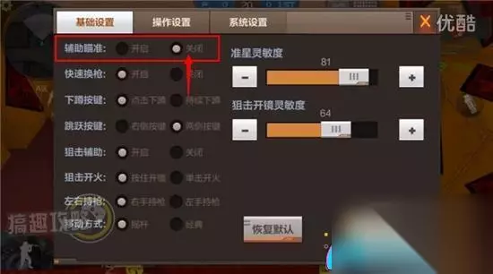 3、站在最高处,此时我们需要进行一些设置,将基础设置中的辅助标准功能关闭,以免在跳箱子的过程中造成干扰。