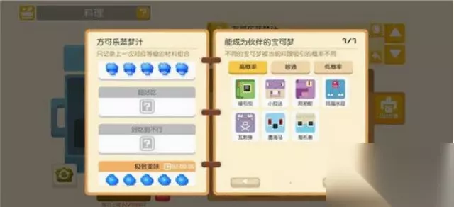 2、方可乐蓝梦汁 (1)烹饪条件:放足量的蓝色 (2)功能:吸引蓝色类宝可梦