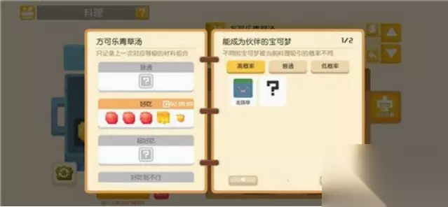 7、方可乐黏黏糊 (1)烹饪条件:放足量的蘑菇外加多放点柔软的东西 (2)功能:吸引毒属性宝可梦