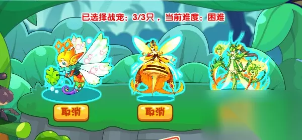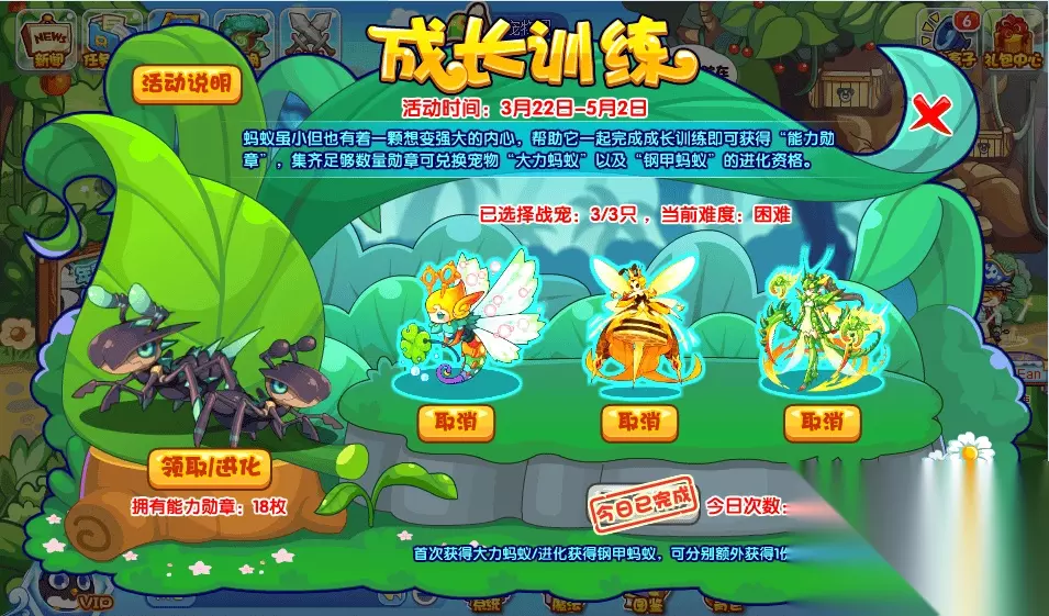 活动只有三次挑战机会,成功与否均扣除次数。所以大家要小心应战哦~我们三只全选,战斗胜利可以获得能力勋章6枚!一天最多拿下18枚。 领取:大力蚂蚁 需要30枚能力勋章,开启:钢甲蚂蚁 进化需要50枚能力勋章,领取或进化勋章将会扣除,不进行累计。 BOSS简析 虹霞翼虫 2000HP 无防控 金翅女王蜂 2000HP 无防控 曼媞丝 2000HP 防控 我们以全选三只的困难为例,BOSS阵容是以上三只宠物同时挑战,这时候比较推荐的是伊莱娜打法,通过控制进行连锁斩杀,也不怕曼媞丝开出防控浪费挑战时间,是最稳妥的一个打法。其余的均推荐类似的,在控制状态下消灭上一只宠物的,例如魔武、苍羽、末日、石王等宠物。注意挑战失败/逃跑均扣除次数哦!