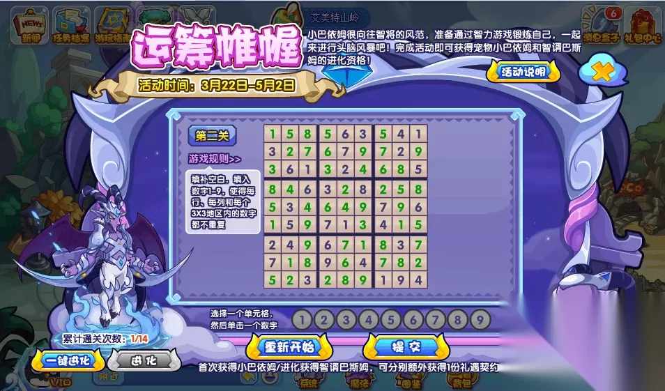 洛克王国运筹帷幄活动攻略 活动时间:3月22日~5月2日 活动难度:★★★☆☆ 智慧的将领往往是不断的锻炼自己的智力,从而运筹帷幄提升自己!小洛克们也来参与一下吧~ 活动可以说是近期最“阴间”的难度啦,当然是对于数独萌新来说: 活动的要求也是在九宫格内填入1~9的数字,使得每一行与每一列与每个九宫格(3x3)范围内数字不重复,正确即可通关,每天开设两个关卡。