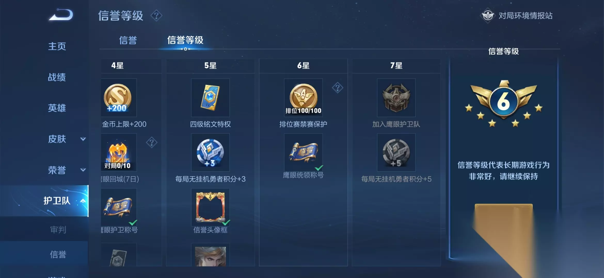 王者荣耀鹰眼护卫队加入方法: 王者荣耀鹰眼护卫队是前端时间王者官方刚出的一个角色,也可以说是裁判,用来判定对局是否有违规现象的发生,如果有那就可以对其做出相应的惩罚,有点类似于官方代理人的意思,但是这个鹰眼护卫队也不是什么人都可以进入的,你得满足一定的条件。那么要满足的条件在下方给大家盘点了出来,希望大家看完之后能有所了解。 一、鹰眼护卫队申请加入条件 1.玩家游戏等级≥25级、游戏信誉达到7级且信誉积分=100分。 2.需要通过入队的模拟裁决测试。