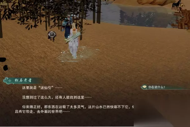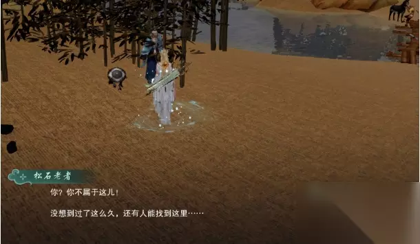 5、就是沿着路一直走,到尽头可以看到了,刚进图的时候我们是在地图偏下的位置的。 6、然后和松石老者他老人家互动