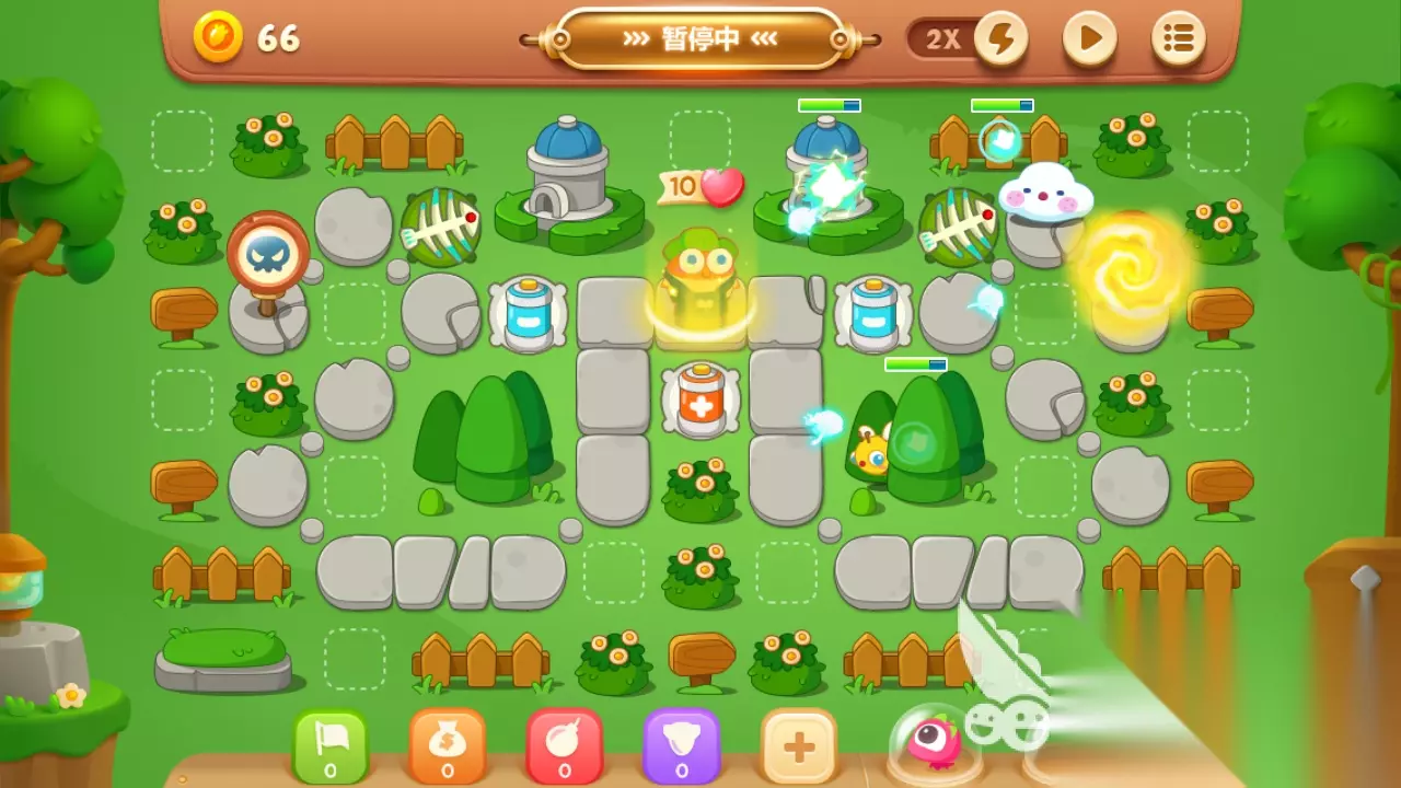 一、首要咱们要在两个出口的周围放上两个鱼刺 这两个一次便是咱们最开端的炮塔了,它能够协助咱们打过好几波。在这里要跟咱们说一下,这两个出口在一开端的时分并不是一会儿就全出来小怪物的,第1步的时分是先从左面先出来,所以说咱们要让右边的那个鱼刺去打他左下方的那一个小栅门。在左面的第1波怪物进攻完了之后,右边的那个小栅门还不会被彻底的打下来,所以说这个时分咱们在让左面的那个鱼刺打他那儿的栅门,这样下来这两头的两个栅门就会很简单的被打掉了。 当这两个栅门被打掉了之后,里边的两个负电池塔就出来了,然后咱们就需要去打萝卜正下方的那一个小草丛了,在这个草丛的后边有一个正的电池塔。有关于这两种电池的信息信任咱们应该都是理解的,如果说两个满级的两种电池卡,离得比较近的话,那么他们两个塔之间就会构成一条带有能量的线,当怪物们经过这条能量线的时分也会遭到损伤哦。