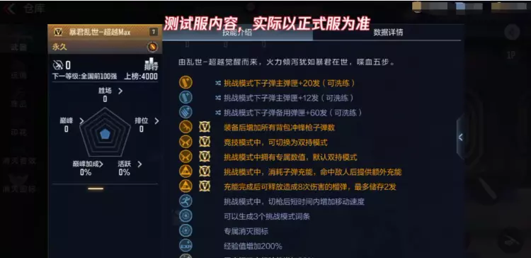 乱世-超越和乱世-超越Max都是封神狂潮的专属奖励,给大家介绍一下乱世-超越Max这把武器,可生成3个挑战模式词条,玩家可根据自己的喜好来选择不同的词条,挑战模式中拥有专属数值,默认双持模式。同时竞技模式中也可切换为双持模式。