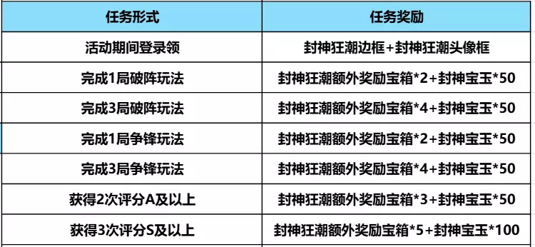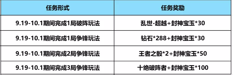 玩家完成1局破阵玩法可领取永久的乱世-超越+封神宝玉*30,完成1局争锋玩法可领取钻石*288+封神宝玉*30,完成2局争锋玩法可领取王者之骰*2+封神宝玉*50,完成3局争锋玩法可领取【称号】十绝破阵者+封神宝玉*100,这么多丰厚的奖励只需要完成指定玩法即可领取,详细请看下图。