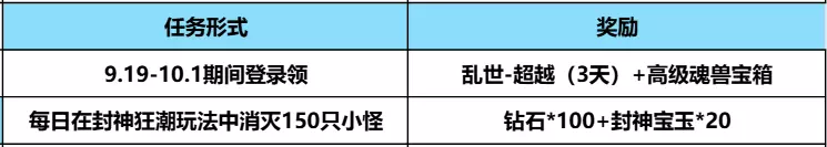 封神战狂潮活动现已上线,玩家在9月19日-10月1日登录游戏,即可领取乱世-超越(3天)和高级魂兽宝箱,这样一来就可以直接参与全新挑战神器啦。