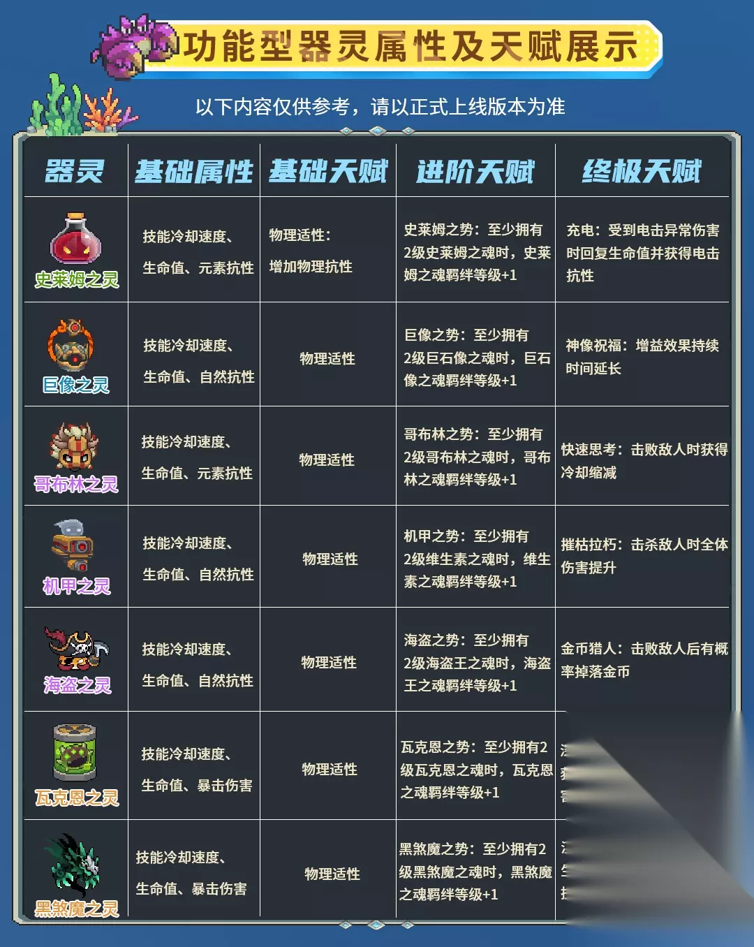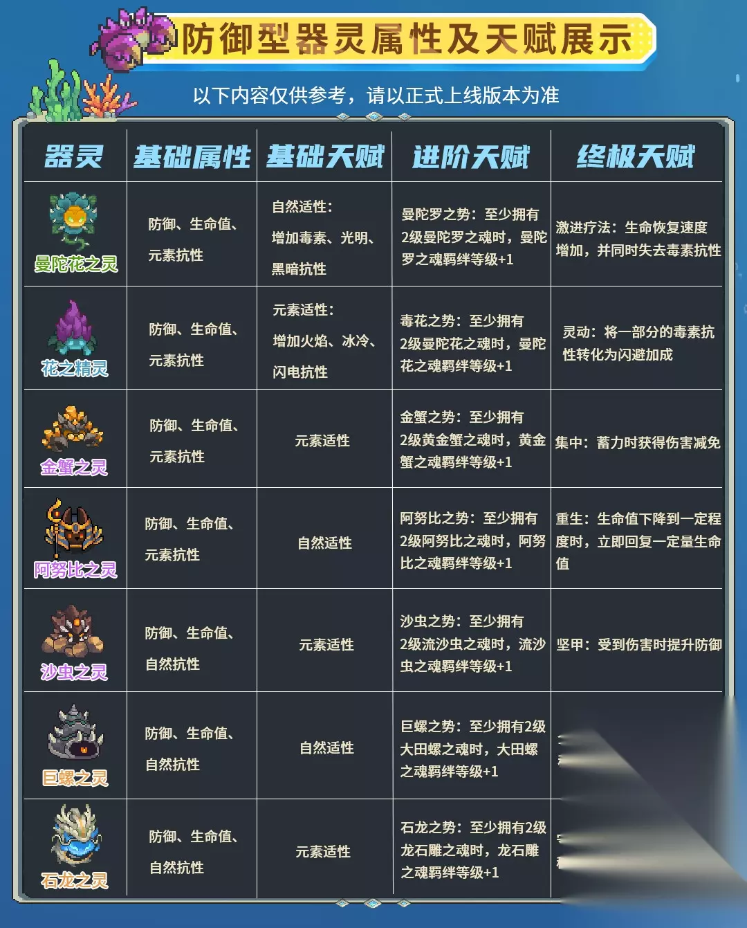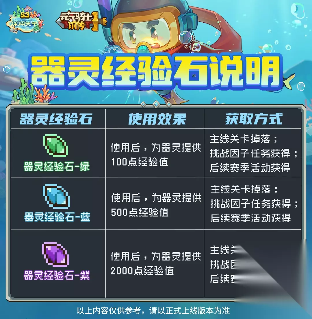 三.器灵等级 S3更新以后器灵等级为60级 获得器灵后将直接解锁基础天赋(无法升级)。 器灵升级到30级以后获得进阶天赋。 终极天赋通过器灵升阶获得。 基础天赋,进阶天赋,终极天赋对应每个器灵加成都不一样,看最上面第一条有详细介绍。 器灵经验石只能通过主线副本,因子挑战任务,后续赛季游戏内活动获得。 经验石-绿,增加器灵100经验 经验石-蓝,增加器灵500经验 经验石-金,增加器灵200经验