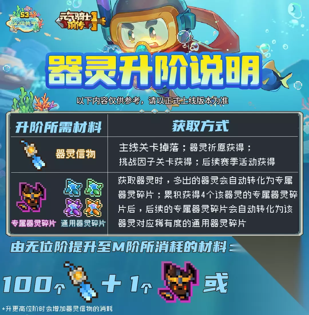 四.器灵进阶 终极天赋会为器灵提供强力的独特加成,当器灵达到M位阶时解锁;当器灵每提升1位阶,将增多1级终极天赋等级,最多为4级。 刚获得的器灵默认位阶为无位阶,可以提升至M位阶、G位阶、S位阶和U位阶。 提升器灵位阶需要用到器灵信物、专属器灵碎片或通用器灵碎片,由无位阶升至M位阶需要消耗100个器灵信物和1个专属器灵碎片或2个通用器灵碎片(通用器灵碎片需要与升阶器灵拥有相同稀有度),继续提升器灵位阶将会增加器灵信物的消耗,但专属器灵碎片及通用器灵碎片的消耗量将不会增加。 每次在《铁心》这里抽取将额外获得1器灵信物。 抽取会获得器灵。 当获得重复的器灵会获得,专属器灵碎片。 当获得4个专属器灵碎片后,会获得一个同阶通用器灵碎片。 (比如我抽到一个传奇的巫师器灵,再次抽到这个传奇巫师器灵就会变成巫师专属器灵,巫师专属器灵抽到四个以后就会变成一个传奇通用器灵)。
