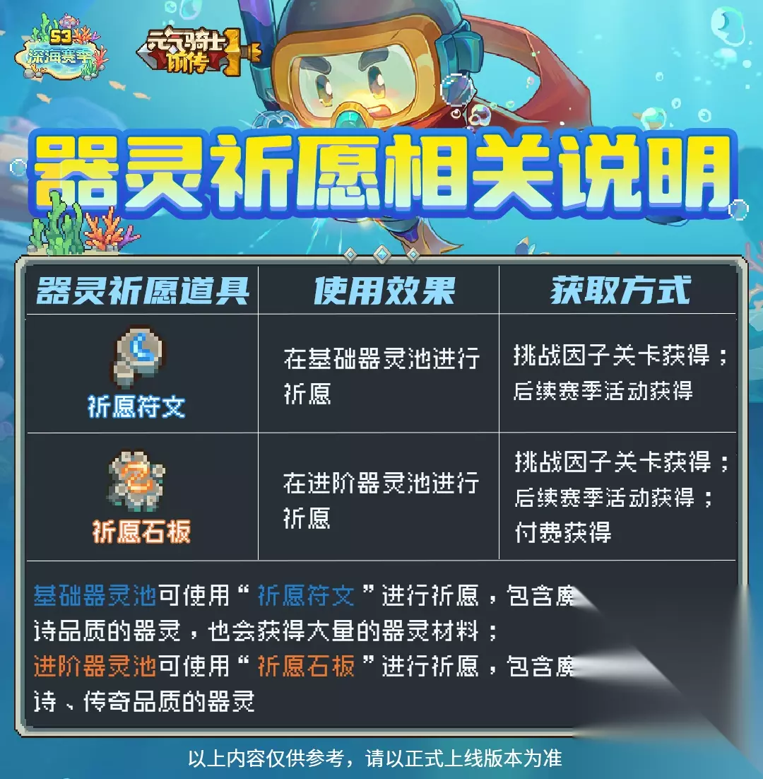 二.器灵获取 在地图找到《铁心》然后通过祈愿符文和祈愿石板抽取。 1.祈愿符文:基础器灵池 获得方式: S3赛季更新以后新增的《挑战因子》关卡玩法可以获得,后续有活动副本或者特殊活动也可以获得。 可以抽取到魔化,稀有,史诗的器灵 2.祈愿石板:进阶器灵池 获取方式: S3赛季更新以后新增的《挑战因子》关卡玩法可以获得,后续有活动副本或者特殊活动也可以获得,也可以直接氪金获得。 可以抽取到魔化,稀有,史诗,传奇的器灵。 每10次必出史诗器灵。 每40次必出传奇器灵。 30次会赠送1个自选器灵宝箱,宝箱内含7只传奇品质器灵,包括黑骑之灵、蛇发之灵、巫师之灵、巨螺之灵、石龙之灵、瓦克恩之灵和黑煞魔之灵。该自选器灵宝箱仅可生效一次。