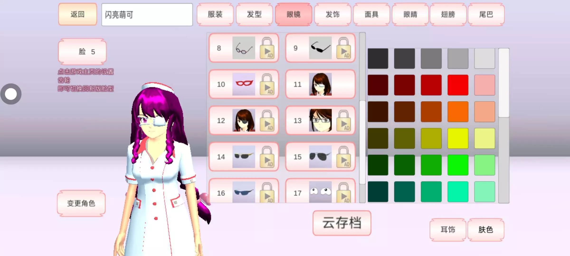 发型选45号。然后要粉色的,衣服选择护士,材质二要红色的。眼罩白色,眼睛要粉色的,再把名字改成海瑟。就搞定了。