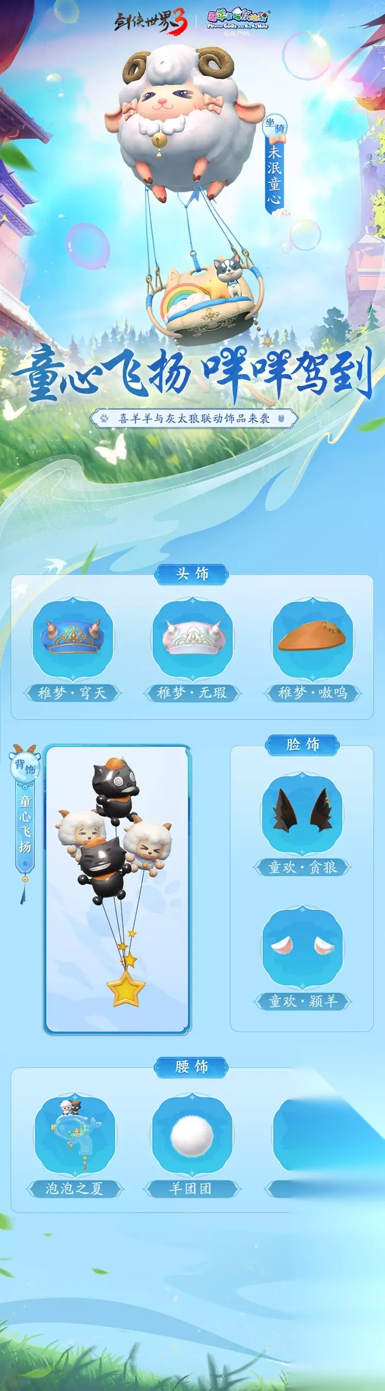 除此之外,还有喜羊羊与灰太狼联动饰品惊喜来袭,头饰【稚梦】系列软萌可爱、脸饰【童欢】系列帅气潇洒,还有灰太狼和喜羊羊为主题的气球背饰【童心飞扬】让你尽享童年乐趣,萌动江湖!