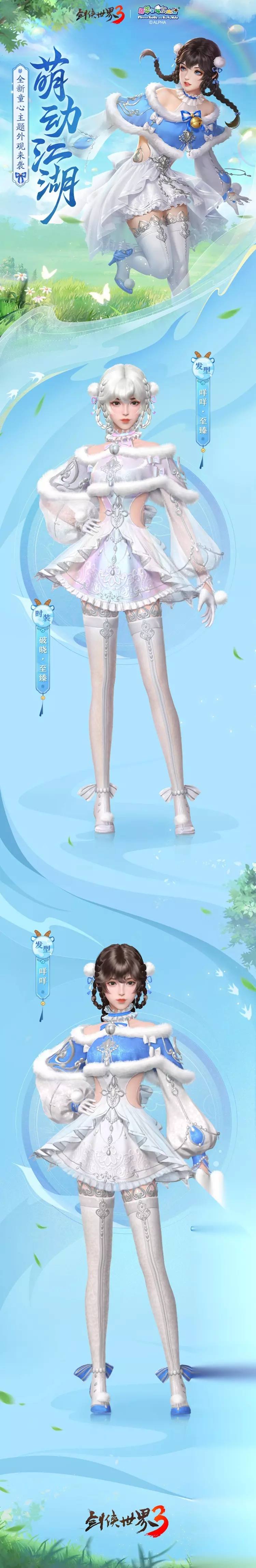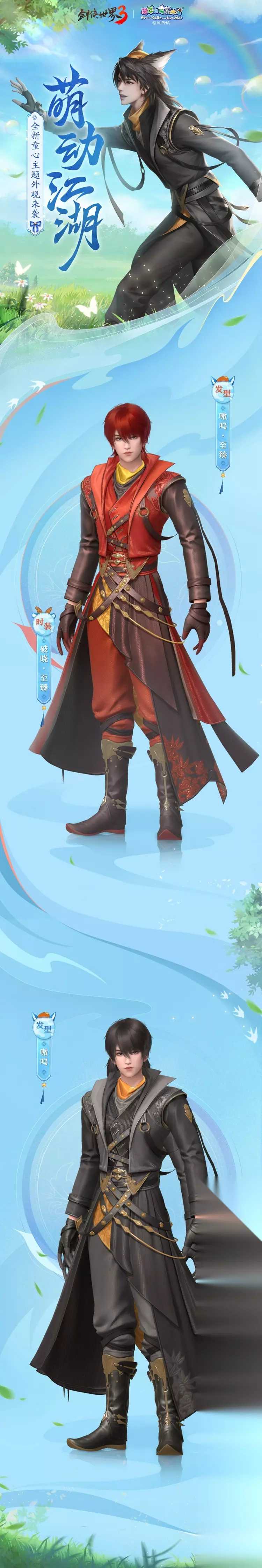 《剑侠世界3》全新童趣主题时装惊喜上线,以“梦回童年”为核心设计思路,在保留羊狼元素的同时融入经典剑侠美学。男款时装【锦夜】华贵霸气,将狼王的潇洒不羁展现的淋漓尽致。女款时装【破晓】俏皮可爱,胸前的铃铛和羊角辫的设计让整款时装显得萌趣十足!穿上这两套新衣,犹如化身狼王与羊公主,成为剑侠江湖最亮眼的一道风景线!