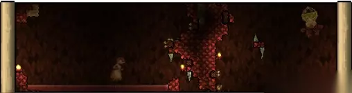 地下猩红之地是一种困难模式生物群落是血肉墙被打败时生成的生物群落之一。它是地表层猩红之地的地下版本,出现在洞穴层及更下方。它的运作方式类似于地表困难模式猩红之地,由猩红石和猩红沙组成;不过它会生成不同的敌怪。地下猩红之地就像地表猩红之地那样蔓延,并且同样不能蔓延至神圣之地中(也不能蔓延至地下神圣之地)。另外,可以通过破坏猩红祭坛创造小块地下猩红之地,在祭坛被毁时世界中会有单个随机石块转化为猩红石。 地下猩红之地并不会压制其他地下与洞穴敌怪的生成。 当玩家附近有至少 200 块猩红石块/猩红沙块时视为玩家身处地下猩红之地生物群落中。 所有在地下猩红之地中被击杀的敌怪都有 1/5(20%)几率掉落暗影之魂。在专家模式中,此几率提升为 1/3(33%)。