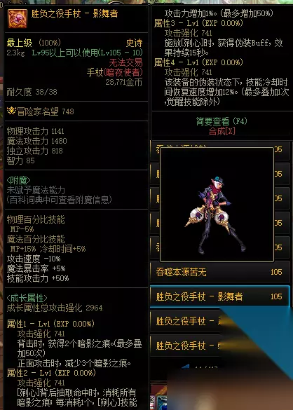 《DNF》105级胜负之役手杖影舞者装备属性最近难住了不少玩家,关于这个问题,下面有最详细的攻略流程,一起去看看吧。这款游戏中需要做的任务还是蛮多的,每个任务都给出了提示,玩家仔细一点就能发现。 《DNF》105级胜负之役手杖影舞者装备可以通过110级的副本掉落获得,是无法交易的史诗级装备,拥有38耐久度,装备后可以增加1480魔法攻击力和1141物理攻击力。