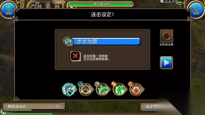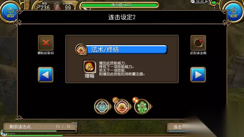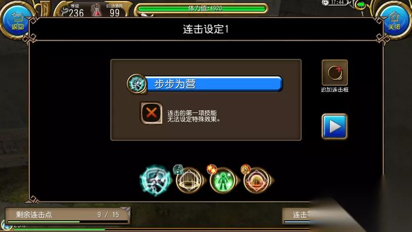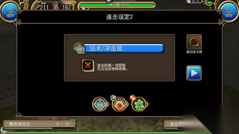 最简单连击为 步步为营+结界+魔灌(1蓝连击) 接裸终结 锁近怪 是的,裸终结 每一次循环设置最低5秒间隔 两分钟测试为14发,优先是效率比较快,步骤最简单,缺点是少一个终结的连击效果,吃不到增幅的增加50伤害,后面地图可能伤害不足。 重点!!!效率最高连击,目前1分钟8发终结。需要学习灵魂+舞者技能