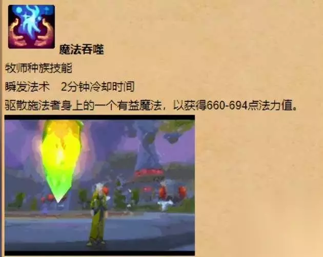 魔法吞噬:牧师种族技能,瞬发法术,2分钟冷却时间,驱散施法者身上的一个有益魔法,获得660到694点法力值。