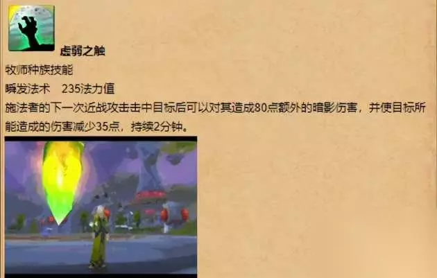 虚弱之触:牧师种族技能,瞬发法术,235法力值,施法者的下一次近战攻击,击中目标后可以对其造成80点额外的暗影伤害,并使目标所能造成的伤害减少35点,持续2分钟。