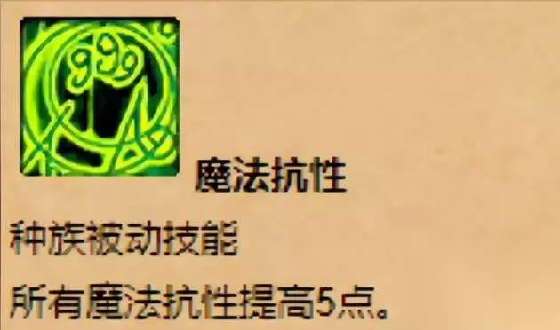 魔法抗性:种族被动技能,所用魔法抗性提高5点。