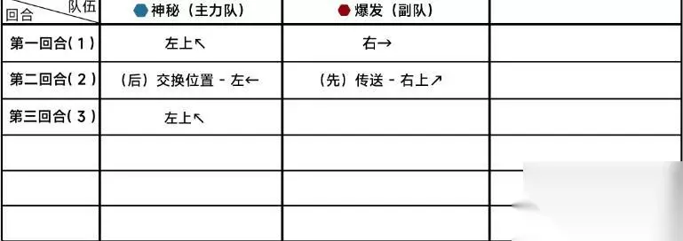 五、具体打法 三星攻略 主力队 第一回合(1)左上 第二回合(2)后交换位置、左 第三回合(3)左上 副队 第一回合(1)右 第二回合(2)先传送、右上