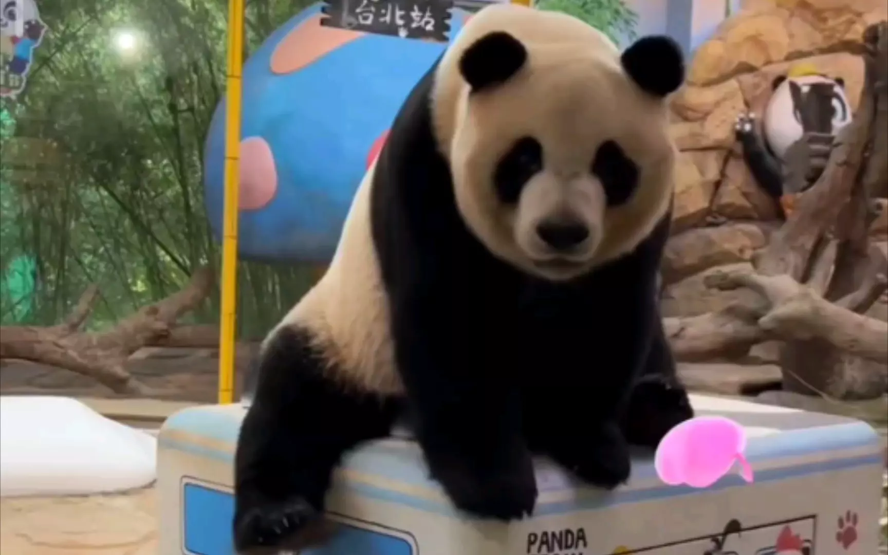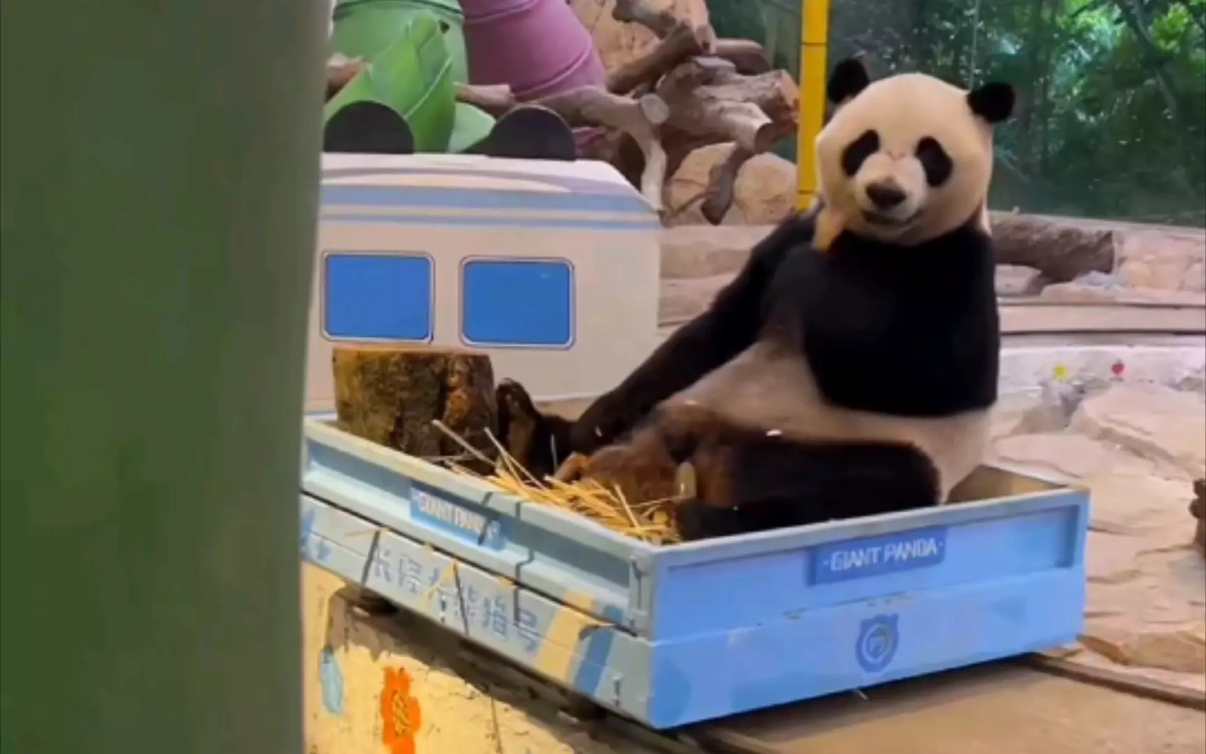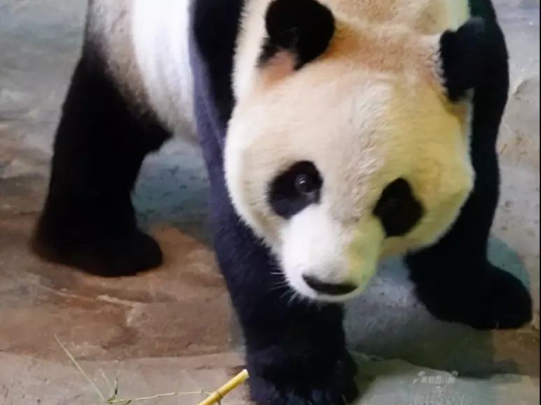 在熊猫基地里,大熊猫酷酷的竹笋掉到沟里,饲养员马上给它补上了食物,视频记录下了酷酷享用补给食物的可爱模样。