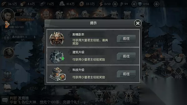 区别于别的策略游戏的单线升级方式,《王权无双》采用的是建筑流+体力流的双升级模式。 在升级方面点击问好,其实可以发现游戏获取君主经验的方式:剧情副本、建筑升级、科技升级。其实建筑升级和科技升级其实是一个概念。 1体力=1经验,这个是众所周知的等式。那么,体力就成为了升级的必要条件。
