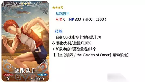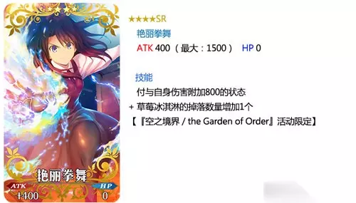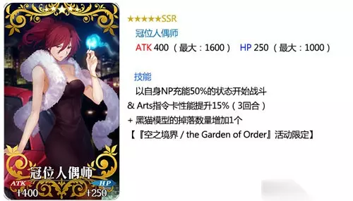 卡池礼装: 装备期间限定概念礼装「★5(SSR)老成之翁」「★5(SSR)冠位人形师」「★4(SR)歪曲之魔眼」「★4(SR)鲜艳拳舞」「★3(R)短跑运动员」「★3(R)Repeat Magic」可以让本次活动副本内掉落的活动专用道具「黑猫模型」「草莓冰淇淋」「矿泉水」的掉落数增加。 ※「★3(R)短跑运动员」「★3(R)Repeat Magic」在pick up期间内可以通过友情点数召唤。